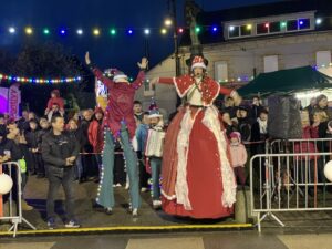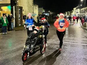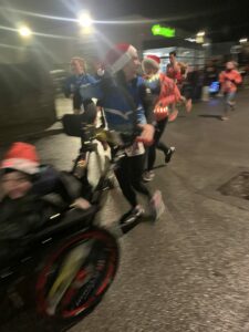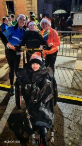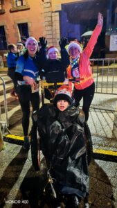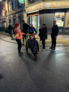 Dix-huit heures : Le départ est donné ! Tous s’élancent pour ces 8 km. Nous sommes plusieurs hippocampes et joëlettes à les suivre. Nous allons donc faire 4 tours de la ville, sur une chaussée glissante et le dernier tour sous la pluie. Jules est très content et observe toute cette animation dans les rues, les maisons décorées pour Noël, les géants qui déambulent et il écoute la musique. Nous sommes encouragés tout au long du trajet et notamment par les parents de Jules, nos familles, et par Maïwenn et Aziliz qui sont aussi venues malgré la pluie !